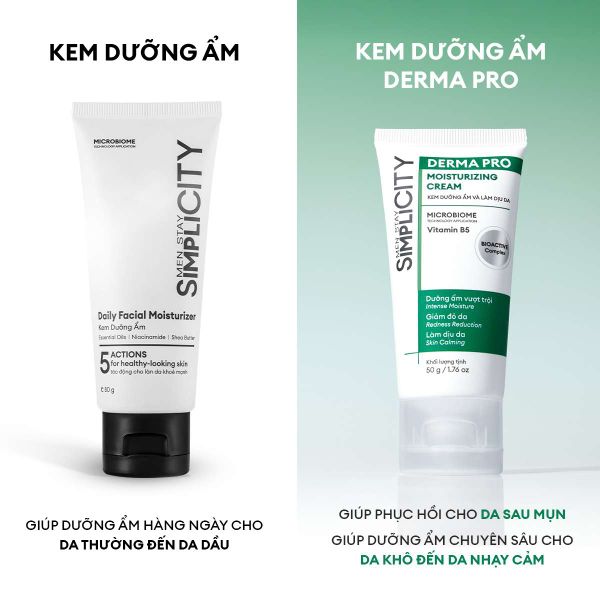 Men Stay Simplicity hiểu rất rõ tâm lý của anh em: ngại nhất là kem dưỡng dày, nhờn và bí da. Vì vậy, Derma Pro được phát triển với công thức không gây bít tắc lỗ chân lông, cam kết 3 Không: không bết dính, không bí da, không gây mụn.