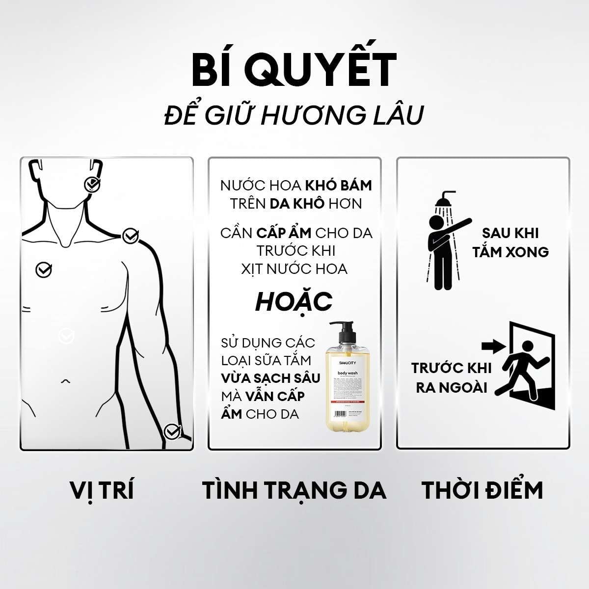 Giữ chai cách da khoảng 5-10cm, xịt nhẹ lên cổ tay, sau tai, gáy hoặc trước ngực. Để hương lan tỏa tự nhiên, không chà xát sau khi xịt. Có thể xịt lên áo quần để lưu hương lâu hơn.