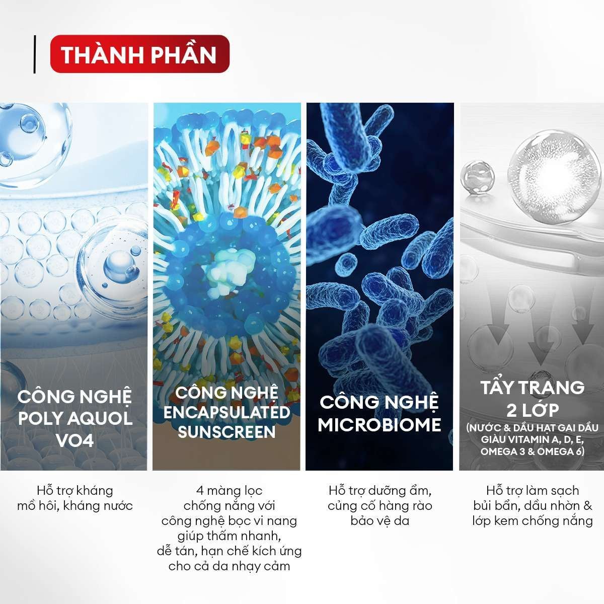 Công nghệ Encapsulated Sunscreen Thấm nhanh, dễ tán, hạn chế kích ứng |