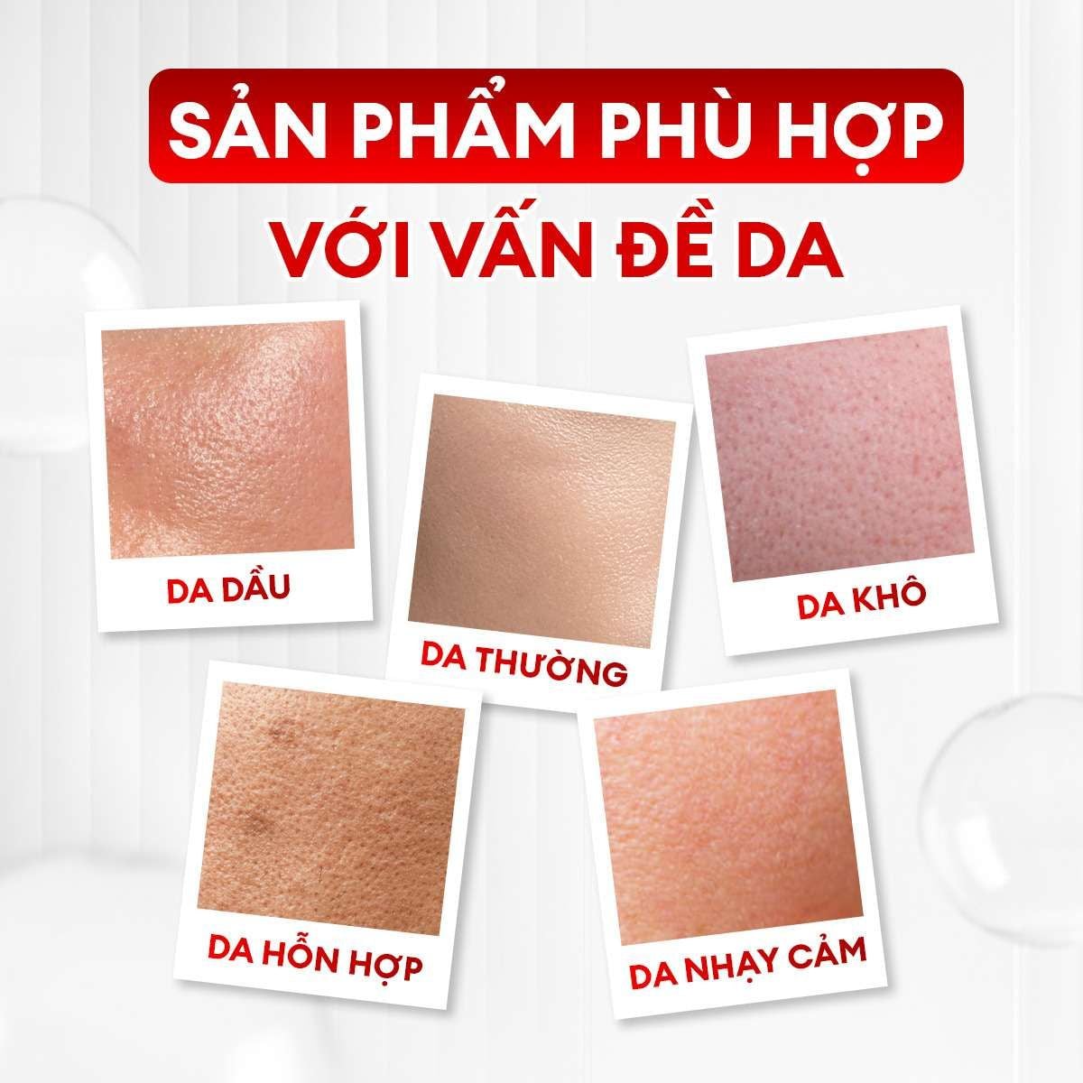 | Phù hợp với | Nhiều loại da; Da dầu, dễ bít tắc do bụi bẩn, mồ hôi; Người dùng kem chống nắng, cần làm sạch nhanh gọn; Chống nắng hàng ngày & khi hoạt động ngoài trời |