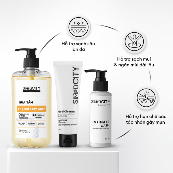Combo Làm sạch 3in1: Sữa tắm tinh dầu, sữa rửa mặt và dung dịch vệ sinh giúp làm sạch toàn diện từ mặt đến cơ thể, hỗ trợ kháng khuẩn, kiểm soát mùi và dưỡng ẩm da khỏe – sạch – thơm mát mỗi ngày.