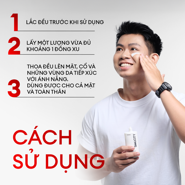 Buớc 3: Thoa đều lên mặt, cổ và những cùng da tiếp xúc với ánh nắng. Dùng được cho cả mặt và toàn thân.