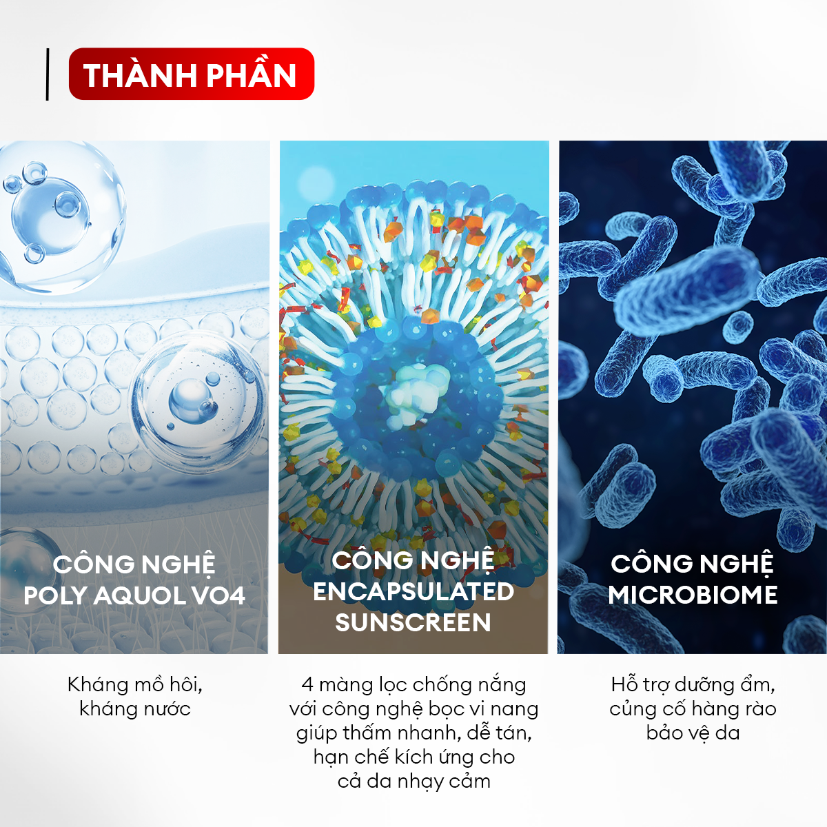 Công nghệ Encapsulated Sunscreen Thấm nhanh, dễ tán, hạn chế kích ứng |