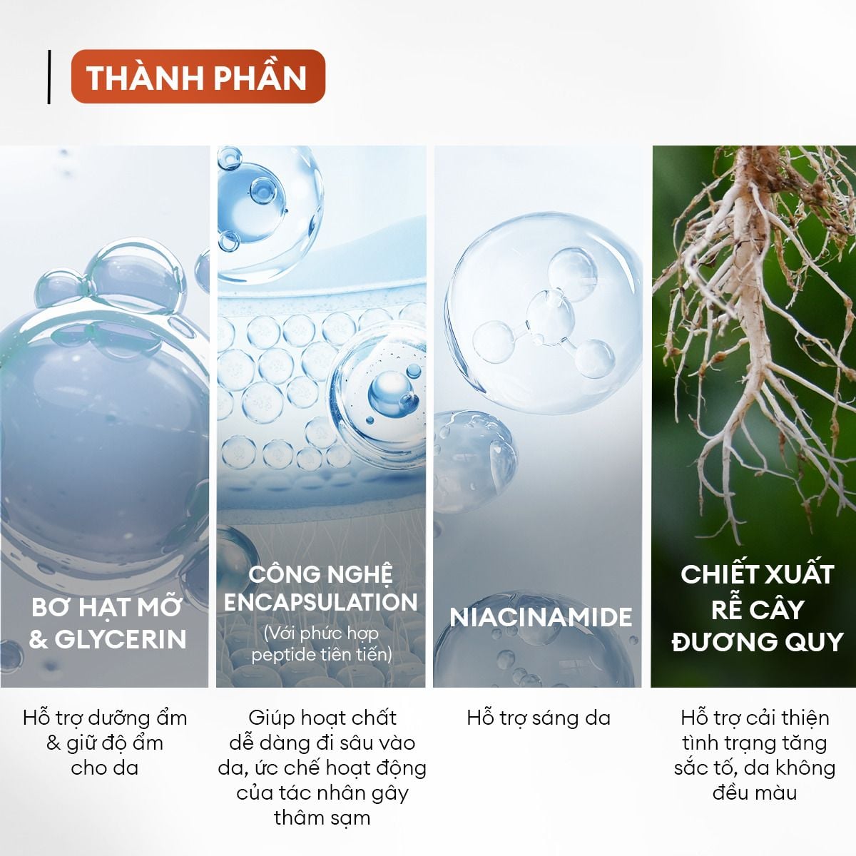 Chiết xuất Rễ cây đương quy Ức chế gốc tự do, giảm thâm. Cải thiện tình trạng tăng sắc tố, da không đều màu, sạm, nám |