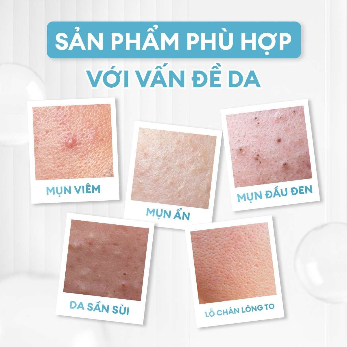 | Phù hợp với | Nhiều loại da; Da dầu mụn; Da mụn ẩn; Da có mụn sưng viêm tình trạng nhẹ và vừa |