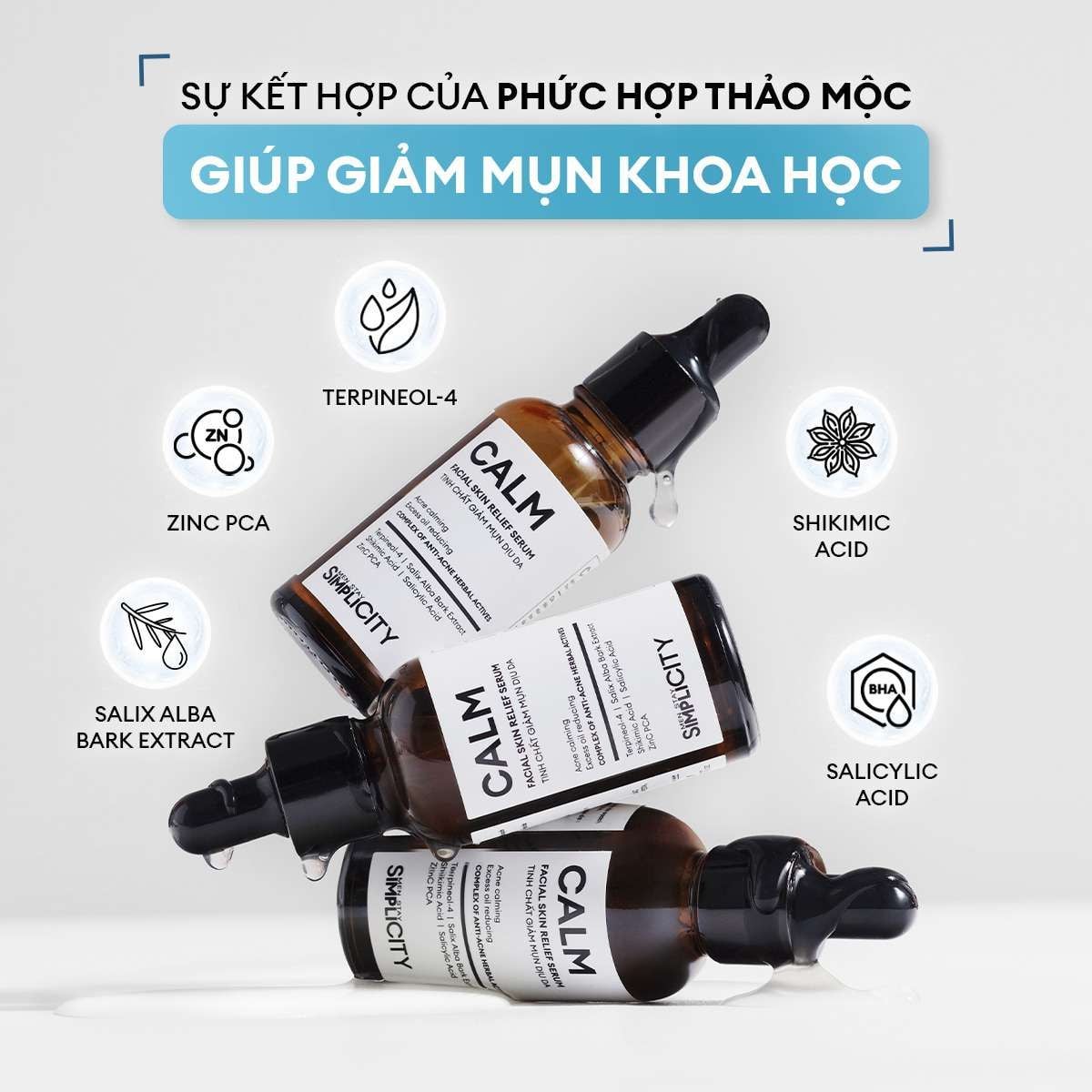 Sự kết hợp của phức hợp thảo mộc giúp giảm mụn khoa học, hỗ trợ dịu mụn sưng viêm.